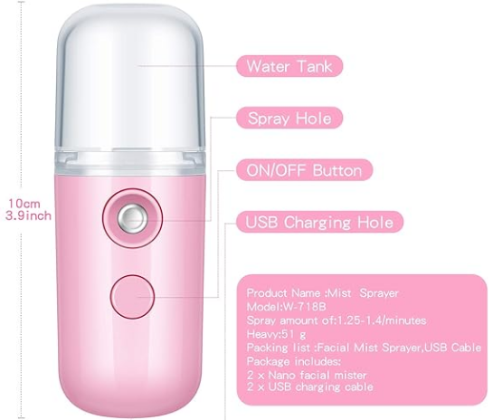 - Operate easily: this portable mini face humidifier is easy to operate, when you need to use it, just fill it with mineral water, and then press the switch, it will automatically emit a soothing cool feeling, USB charging is also easy to use, satisfying your daily needs; Please be careful not to use it while charging to prevent potential safety hazards; It can be applied after about 1 hour of normal charging
